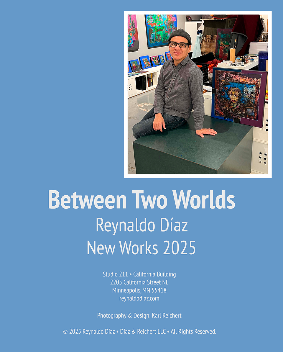 Hot off the press! Between Two Worlds: Reynaldo Díaz New Works 2025, a 24-page catalog featuring Reynaldo’s latest works. $20